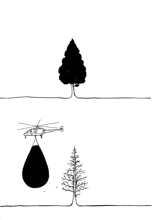 On aime Vincent Broquaire, ses dessins et aussi ses vidéos. L’édition n° 1 de Locked fut adjugée 1000 € le 29 janvier à Drouot sous le marteau de Me Wapler, prémisse à un solo show new-yorkais en mars prochain sur la foire Moving Image. Les prix devraient vite gimper. Mais en attendant, voyons de quoi il retourne. C’est avec une patte sans fioriture et des compositions tirées au cordeau que ce jeune artiste de 28 ans représenté par la XPO Gallery (PARIS 3) s’amuse à nous mettre le cerveau sur le gril. Sans avoir l’air d’y toucher, tout en mêlant burlesque et poésie, il plante à l’envi l’envers d’un décor où Dame nature est sacrément blackboulée par la machinerie humaine et par la suffisance des technologies digitales. Chez Broquaire, pour supprimer un paysage, il suffit d’appuyer sur le bouton, pour soulever des montagnes, il suffit d’une corde, d’un crochet et d’un hélicoptère, pour changer de saison, il suffit de changer d’affiche. Chez lui, on nettoye le globe terrestre comme la table des grands soirs, en enlevant la nappe ; on déplace les îles comme on repique les salades, avec une pelle. Ici, les appareils connectés deviennent de sacrés goinfres qui gobent tout, même les arbres. Mais qu’importe pourvu qu’on ait la photo ! Sourire en demi-teinte comme dans certains contes doux-amer.